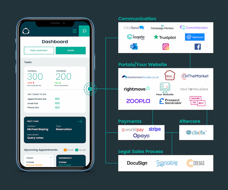 We know housebuilders utilise a variety of platforms to manage the purchase process. From acquiring a lead to delivering purchaser aftercare, ContactBuilder can integrate with a number of market-leading third-party applications, and your very own website, to allow the seamless transfer of key data to and from the platform.